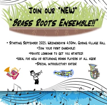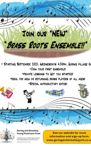 Brass Roots Ensemble — Join the Band! Launching this September, our new Brass Roots Ensemble, is a welcoming new community music group in Goring intended for novice brass players of all ages set up by the Trust in partnership with the Oxfordshire County Music Service. Whether you’ve recently started learning a brass instrument for the first time or are returning after a long break, we offer the opportunity to join an ensemble run by a professional brass teacher, with music carefully selected for your ability and with experienced players on hand to support you as you develop your confidence.