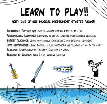 Has your child shown an interest in music? Do they dream of picking up an instrument but you’re unsure where to begin? Our Learn to Play Starter Pack scheme makes starting simple, affordable, and inspiring! For just £30, we are offering five 30 minute lessons with an experienced teacher and with an instrument included. Find out more by clicking on the button below.